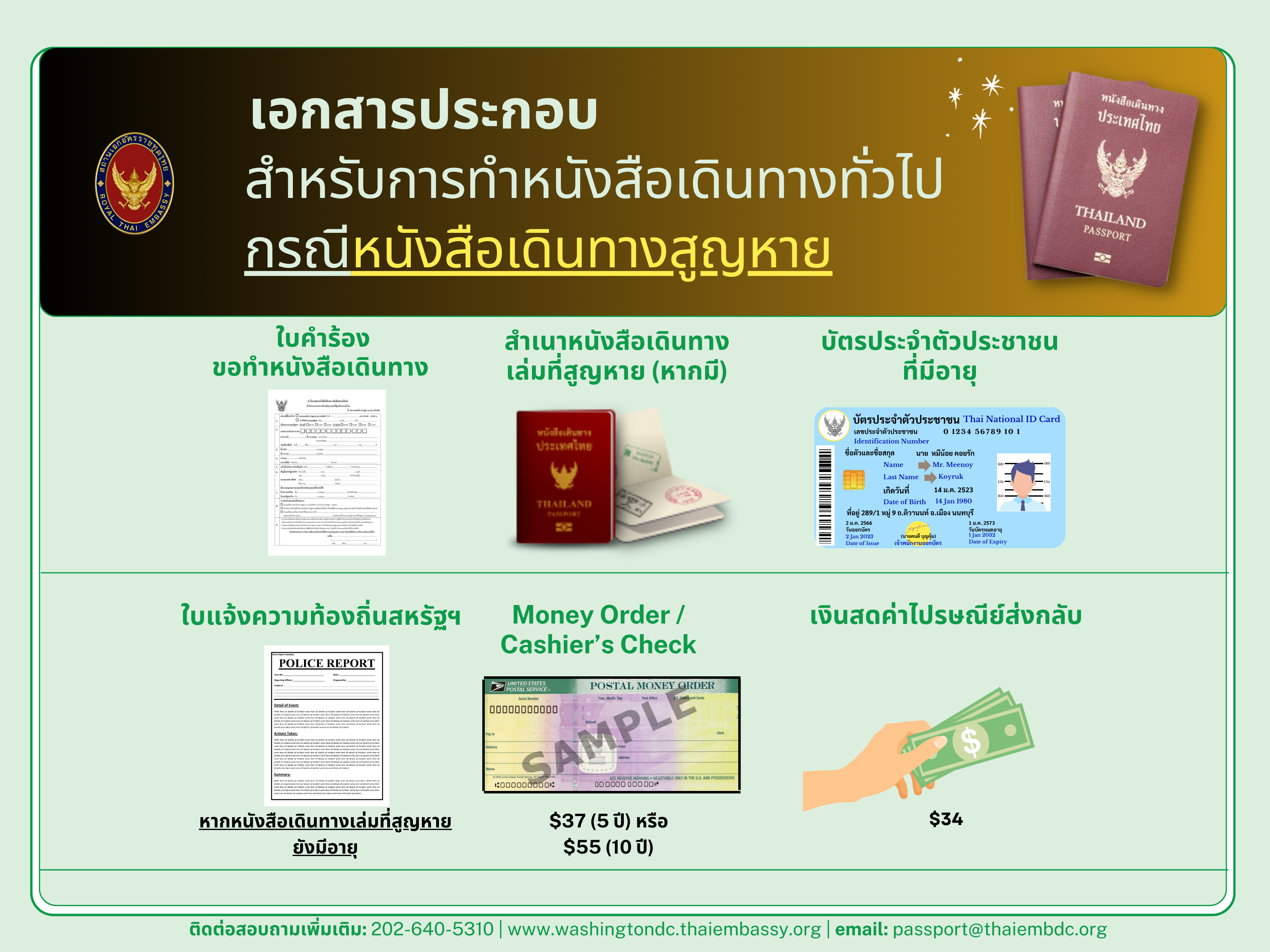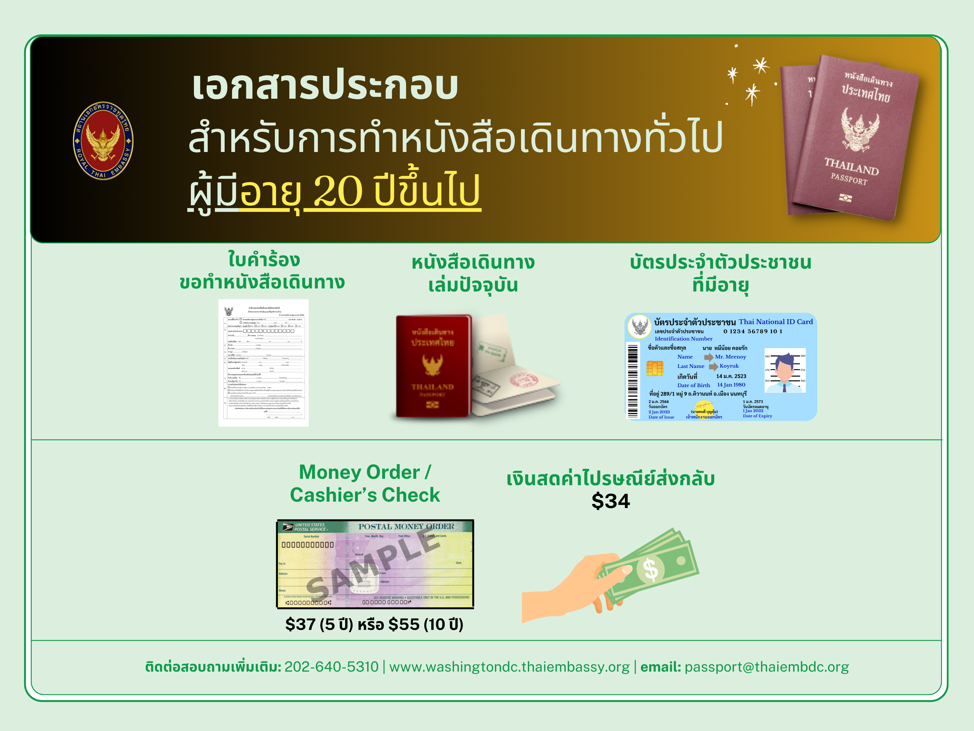 2. หนังสือเดินทางเล่มปัจจุบัน 3. บัตรประจำตัวประชาชนไทยที่มีอายุ 4. ค่าธรรมเนียมการทำหนังสือเดินทาง ชำระด้วย Money Order หรือ Cashier's Check สั่งจ่าย "Royal Thai Embassy" ที่ซื้อมาภายในระยะเวลาไม่เกิน 3 เดือน เท่านั้น (ไม่รับเงินสด เช็คส่วนตัว และบัตรเครดิต)
